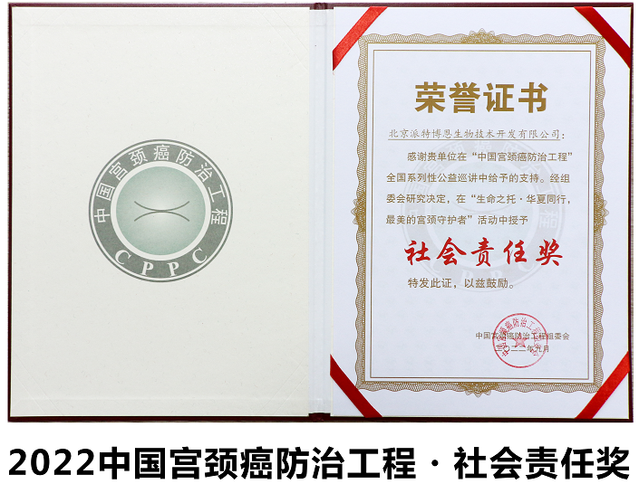 2022年9月,由中國(guó)醫(yī)療保健國(guó)際交流促進(jìn)會(huì)婦產(chǎn)科分會(huì)主辦、山西醫(yī)科大學(xué)第二醫(yī)院協(xié)辦的第十屆中國(guó)宮頸癌防治工程學(xué)術(shù)年會(huì)暨全國(guó)宮頸上皮內(nèi)瘤變及宮頸癌診治熱點(diǎn)論壇順利召開(kāi)。派特生物再次榮獲中國(guó)宮頸癌防治工程“最美的宮頸守護(hù)者·社會(huì)責(zé)任獎(jiǎng)”。
