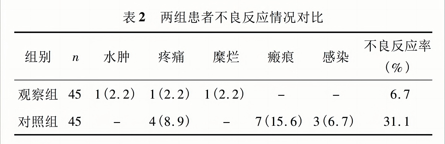 觀察組患者出現(xiàn)1例水腫?1例疼痛?1例糜爛,不良反應率為6.7%;對照組患者不良反應多表現(xiàn)為局部疼痛?瘢痕等,部分患者出現(xiàn)感染情況,其中局部疼痛4例,瘢痕7例,感染3例,不良反應率為31.1%,兩組患者不良反應情況對比差異顯著(P<0.05)?