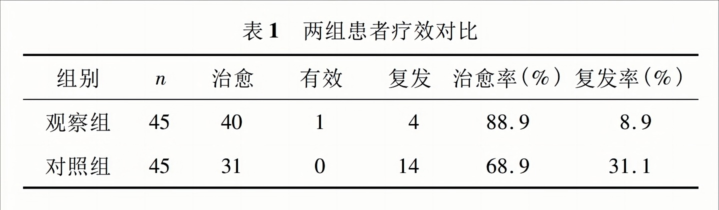 對照組患者4例治療1個月后復發(fā),5例治療2個月后復發(fā),4例治療3個月后復發(fā),治愈率為68.9%,復發(fā)率為31.1%,兩者差異顯著(P<0.05),見表1?