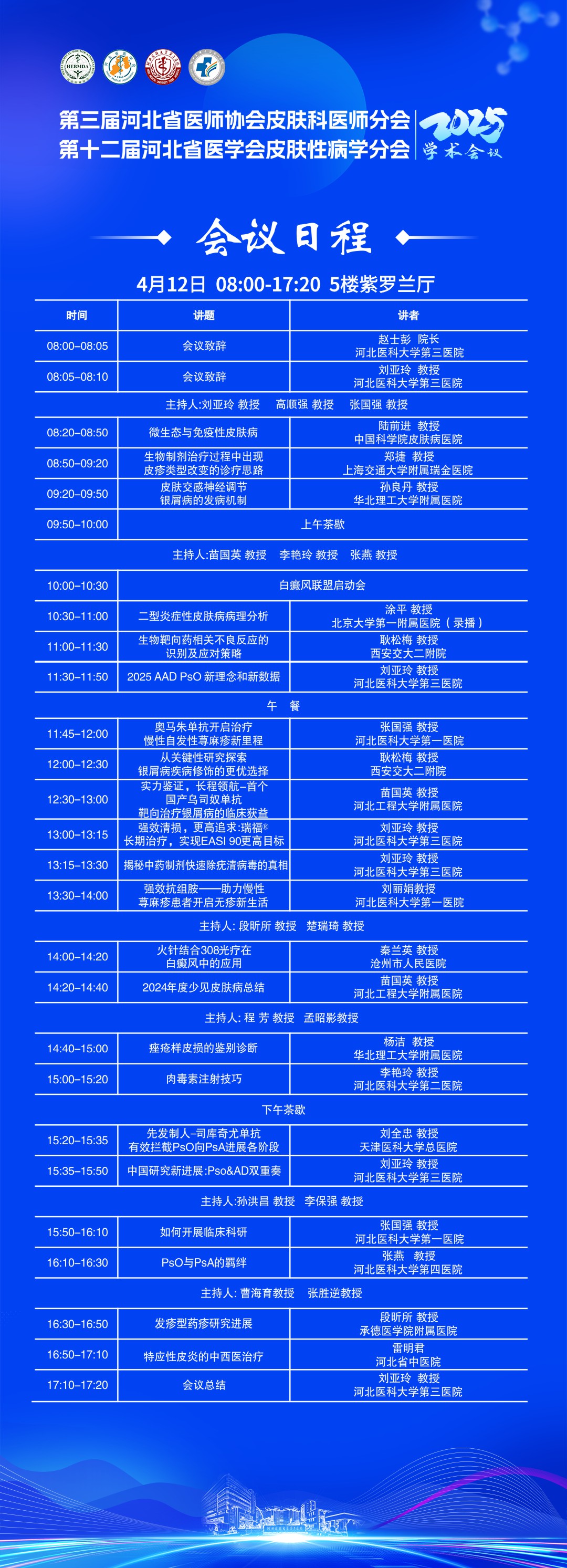 由河北省醫(yī)師協(xié)會皮膚科醫(yī)師分會、河北省醫(yī)學會皮膚性病學分會聯(lián)合主辦,河北醫(yī)科大學第三醫(yī)院、河北醫(yī)科大學第一醫(yī)院共同承辦的“第三屆河北省醫(yī)師協(xié)會皮膚科醫(yī)師分會暨第十二屆河北省醫(yī)學會皮膚性病學分會2025年學術會議”定于2025年4月11日-12日在河北石家莊市舉辦。